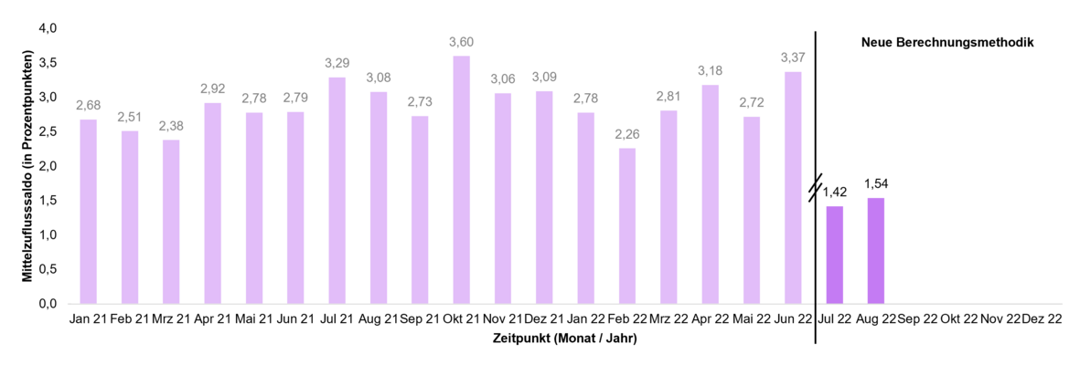 Veränderungen der Mittelzuflüsse und Mittelabflüsse werden über den Fundflow-Faktor ausgedrückt. Dabei werden die monatlichen Mittelzuflüsse des Berichtszeitraums in Relation zu den monatlichen Mittelabflüssen gesetzt. Bei einem Fundflow-Faktor über eins überwiegen die Mittelzuflüsse, bei einem Fundflow-Faktor unter eins die Mittelabflüsse.