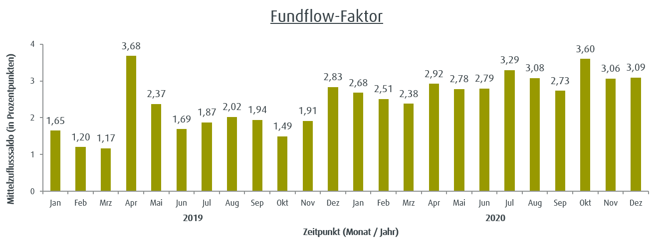 Veränderungen der Mittelzuflüsse und Mittelabflüsse werden über den Fundflow-Faktor ausgedrückt. Dabei werden die monatlichen Mittelzuflüsse des Berichtszeitraums in Relation zu den monatlichen Mittelabflüssen gesetzt. Bei einem Fundflow-Faktor über eins überwiegen die Mittelzuflüsse, bei einem Fundflow-Faktor unter eins die Mittelabflüsse.