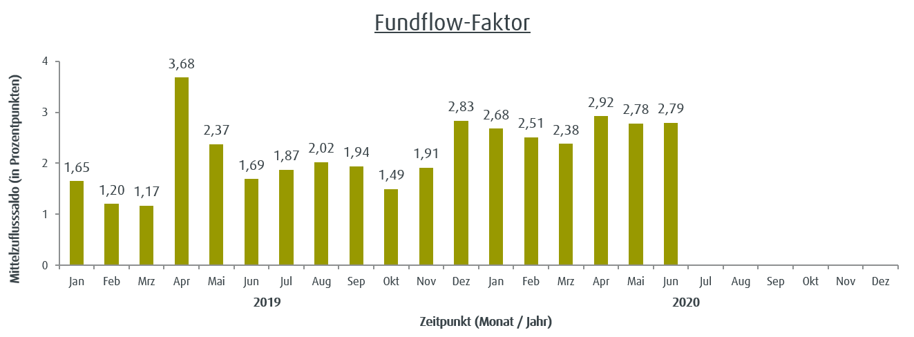 Veränderungen der Mittelzuflüsse und Mittelabflüsse werden über den Fundflow-Faktor ausgedrückt. Dabei werden die monatlichen Mittelzuflüsse des Berichtszeitraums in Relation zu den monatlichen Mittelabflüssen gesetzt. Bei einem Fundflow-Faktor über eins überwiegen die Mittelzuflüsse, bei einem Fundflow-Faktor unter eins die Mittelabflüsse.