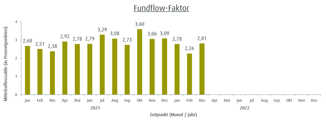 Veränderungen der Mittelzuflüsse und Mittelabflüsse werden über den Fundflow-Faktor ausgedrückt. Dabei werden die monatlichen Mittelzuflüsse des Berichtszeitraums in Relation zu den monatlichen Mittelabflüssen gesetzt. Bei einem Fundflow-Faktor über eins überwiegen die Mittelzuflüsse, bei einem Fundflow-Faktor unter eins die Mittelabflüsse.