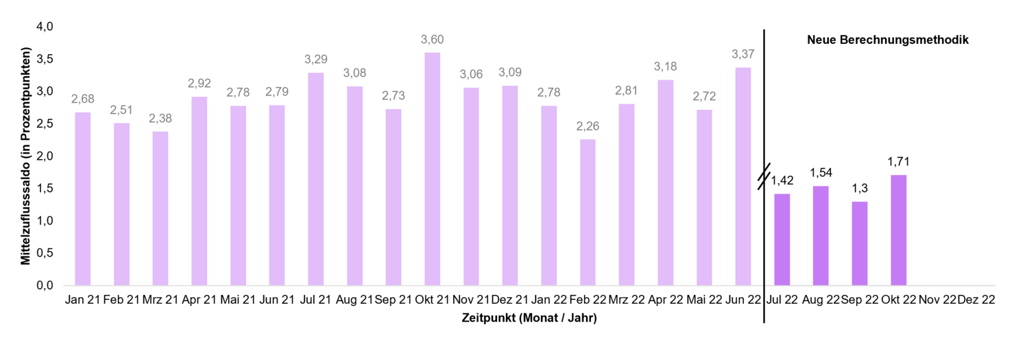 Veränderungen der Mittelzuflüsse und Mittelabflüsse werden über den Fundflow-Faktor ausgedrückt. Dabei werden die monatlichen Mittelzuflüsse des Berichtszeitraums in Relation zu den monatlichen Mittelabflüssen gesetzt. Bei einem Fundflow-Faktor über eins überwiegen die Mittelzuflüsse, bei einem Fundflow-Faktor unter eins die Mittelabflüsse.