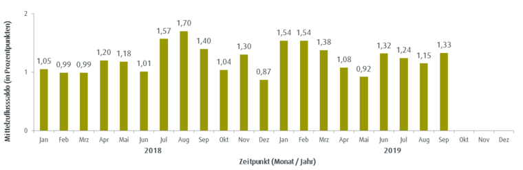 Veränderungen der Mittelzuflüsse und Mittelabflüsse werden über den Fundflow-Faktor ausgedrückt. Dabei werden die monatlichen Mittelzuflüsse des Berichtszeitraums in Relation zu den monatlichen Mittelabflüssen gesetzt. Bei einem Fundflow-Faktor über eins überwiegen die Mittelzuflüsse, bei einem Fundflow-Faktor unter eins die Mittelabflüsse.