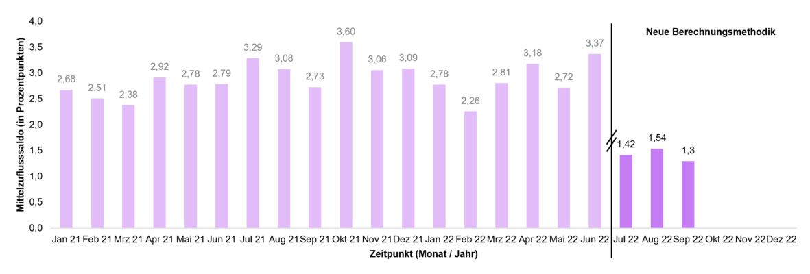 Veränderungen der Mittelzuflüsse und Mittelabflüsse werden über den Fundflow-Faktor ausgedrückt. Dabei werden die monatlichen Mittelzuflüsse des Berichtszeitraums in Relation zu den monatlichen Mittelabflüssen gesetzt. Bei einem Fundflow-Faktor über eins überwiegen die Mittelzuflüsse, bei einem Fundflow-Faktor unter eins die Mittelabflüsse.
