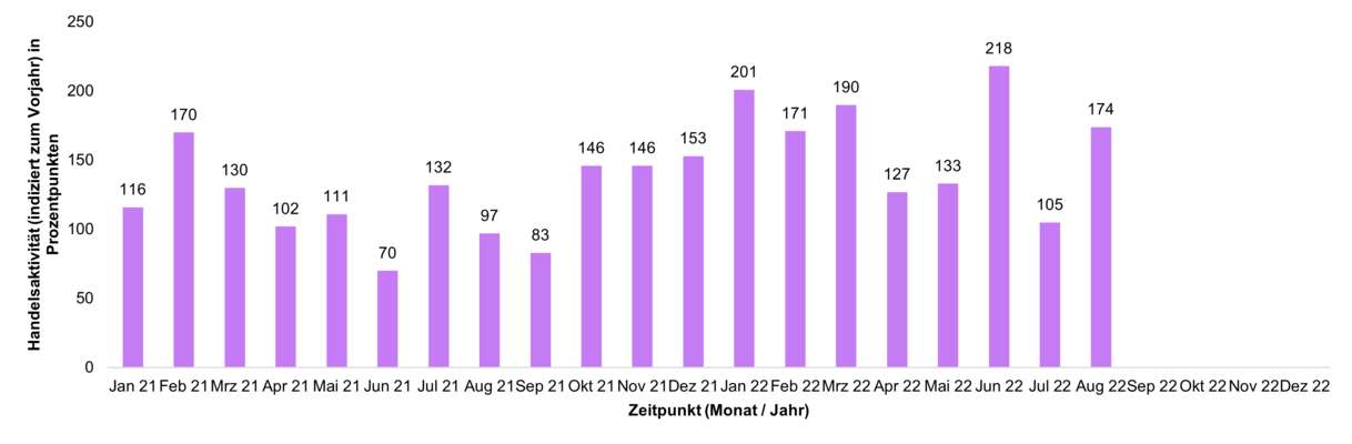 Die Handelsaktivität basiert auf dem Handelsvolumen und lässt unmittelbare Rückschlüsse auf den aktuellen Jahrestrend im Handel mit ETFs bei ebase Kunden zu. Ein Wert von über 100 steht für eine überdurchschnittliche Handelsaktivität der Kunden im Vergleich zum mittleren monatlichen Handelsvolumen des Vorjahres; ein Stand unter 100 zeigt eine unterdurchschnittliche Handelsaktivität an.