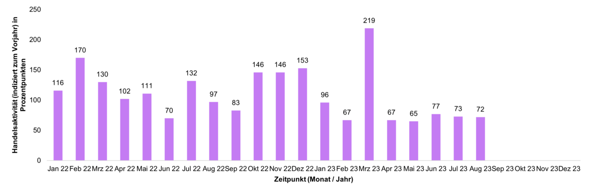 Die Handelsaktivität basiert auf dem Handelsvolumen und lässt unmittelbare Rückschlüsse auf den aktuellen Jahrestrend im Handel mit ETFs bei ebase Kunden zu. Ein Wert von über 100 steht für eine überdurchschnittliche Handelsaktivität der Kunden im Vergleich zum mittleren monatlichen Handelsvolumen des Vorjahres; ein Stand unter 100 zeigt eine unterdurchschnittliche Handelsaktivität an.