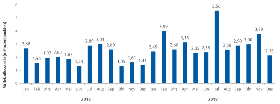 Der ebase Trendnavigator ETF spiegelt die Handelsaktivität von mehr als 1 Million ebase Kunden wieder und wird regelmäßig veröffentlicht. Der ebase Trendnavigator ETF setzt sich aus zwei Elementen zusammen: der Handelsaktivität und dem Fundflow-Faktor. Die Handelsaktivität basiert auf dem Handelsvolumen und lässt unmittelbare Rückschlüsse auf den aktuellen Jahrestrend zu. Ein Wert von über 100 weist auf eine überdurchschnittliche Handelsaktivität der Kunden im Vergleich zum mittleren monatlichen Handelsvolumen von 2018 hin; ein Stand unter 100 zeigt eine unterdurchschnittliche Handelsaktivität an. Veränderungen der Mittelzuflüsse und Mittelabflüsse werden über den Fundflow-Faktor ausgedrückt. Dabei werden die monatlichen Mittelzuflüsse des Berichtszeitraums in Relation zu den monatlichen Mittelabflüssen gesetzt. Bei einem Fundflow-Faktor über eins überwiegen die Mittelzuflüsse, bei einem Fundflow-Faktor unter eins die Mittelabflüsse. Fondsdepots für institutionelle Kunden und die der betrieblichen Altersversorgung werden in der Auswertung nicht berücksichtigt.