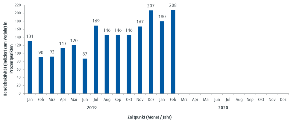 Die Handelsaktivität basiert auf dem Handelsvolumen und lässt unmittelbare Rückschlüsse auf den aktuellen Jahrestrend im Handel mit ETFs bei ebase Kunden zu. Ein Wert von über 100 steht für eine überdurchschnittliche Handelsaktivität der Kunden im Vergleich zum mittleren monatlichen Handelsvolumen des Vorjahres; ein Stand unter 100 zeigt eine unterdurchschnittliche Handelsaktivität an.