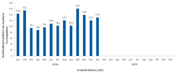 Die Handelsaktivität basiert auf dem Handelsvolumen und lässt unmittelbare Rückschlüsse auf den aktuellen Jahrestrend im Handel mit ETFs bei ebase Kunden zu. Ein Wert von über 100 steht für eine überdurchschnittliche Handelsaktivität der Kunden im Vergleich zum mittleren monatlichen Handelsvolumen des Vorjahres; ein Stand unter 100 zeigt eine unterdurchschnittliche Handelsaktivität an.