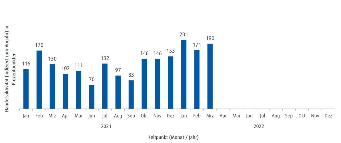 Die Handelsaktivität basiert auf dem Handelsvolumen und lässt unmittelbare Rückschlüsse auf den aktuellen Jahrestrend im Handel mit ETFs bei ebase Kunden zu. Ein Wert von über 100 steht für eine überdurchschnittliche Handelsaktivität der Kunden im Vergleich zum mittleren monatlichen Handelsvolumen des Vorjahres; ein Stand unter 100 zeigt eine unterdurchschnittliche Handelsaktivität an.