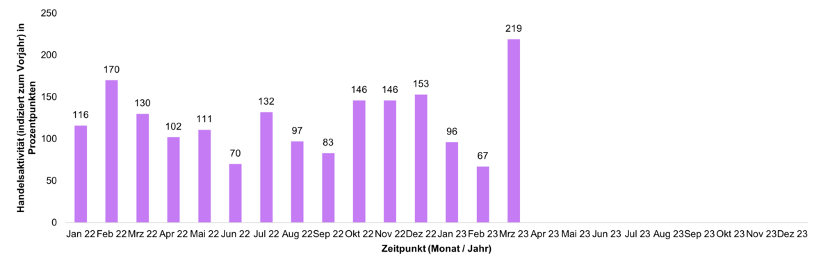 Die Handelsaktivität basiert auf dem Handelsvolumen und lässt unmittelbare Rückschlüsse auf den aktuellen Jahrestrend im Handel mit ETFs bei ebase Kunden zu. Ein Wert von über 100 steht für eine überdurchschnittliche Handelsaktivität der Kunden im Vergleich zum mittleren monatlichen Handelsvolumen des Vorjahres; ein Stand unter 100 zeigt eine unterdurchschnittliche Handelsaktivität an.