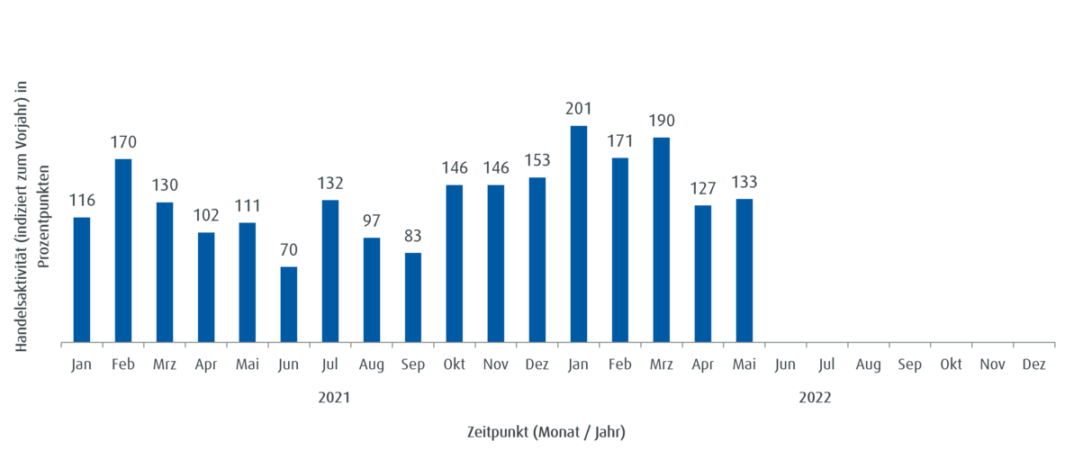 Die Handelsaktivität basiert auf dem Handelsvolumen und lässt unmittelbare Rückschlüsse auf den aktuellen Jahrestrend im Handel mit ETFs bei ebase Kunden zu. Ein Wert von über 100 steht für eine überdurchschnittliche Handelsaktivität der Kunden im Vergleich zum mittleren monatlichen Handelsvolumen des Vorjahres; ein Stand unter 100 zeigt eine unterdurchschnittliche Handelsaktivität an.