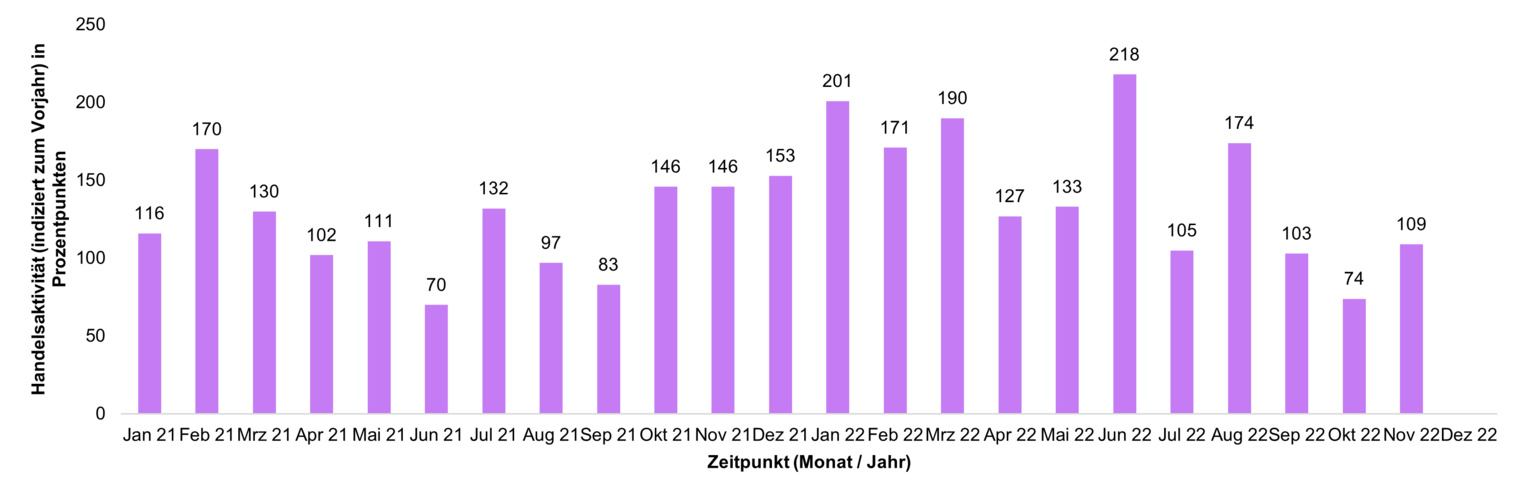 Die Handelsaktivität basiert auf dem Handelsvolumen und lässt unmittelbare Rückschlüsse auf den aktuellen Jahrestrend im Handel mit ETFs bei ebase Kunden zu. Ein Wert von über 100 steht für eine überdurchschnittliche Handelsaktivität der Kunden im Vergleich zum mittleren monatlichen Handelsvolumen des Vorjahres; ein Stand unter 100 zeigt eine unterdurchschnittliche Handelsaktivität an.