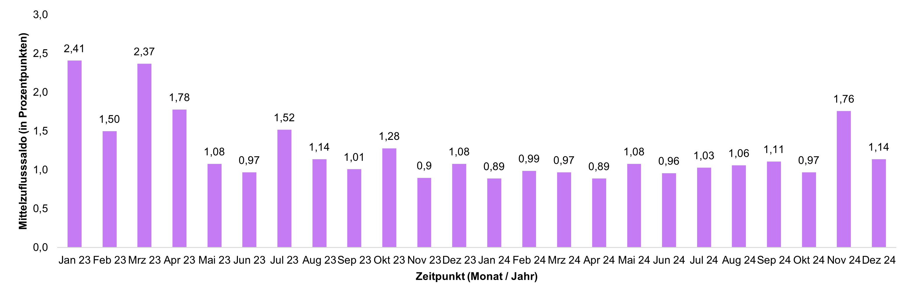 Veränderungen der Mittelzuflüsse und Mittelabflüsse werden über den Fundflow-Faktor ausgedrückt. Dabei werden die monatlichen Mittelzuflüsse des Berichtszeitraums in Relation zu den monatlichen Mittelabflüssen gesetzt. Bei einem Fundflow-Faktor über eins überwiegen die Mittelzuflüsse, bei einem Fundflow-Faktor unter eins die Mittelabflüsse.