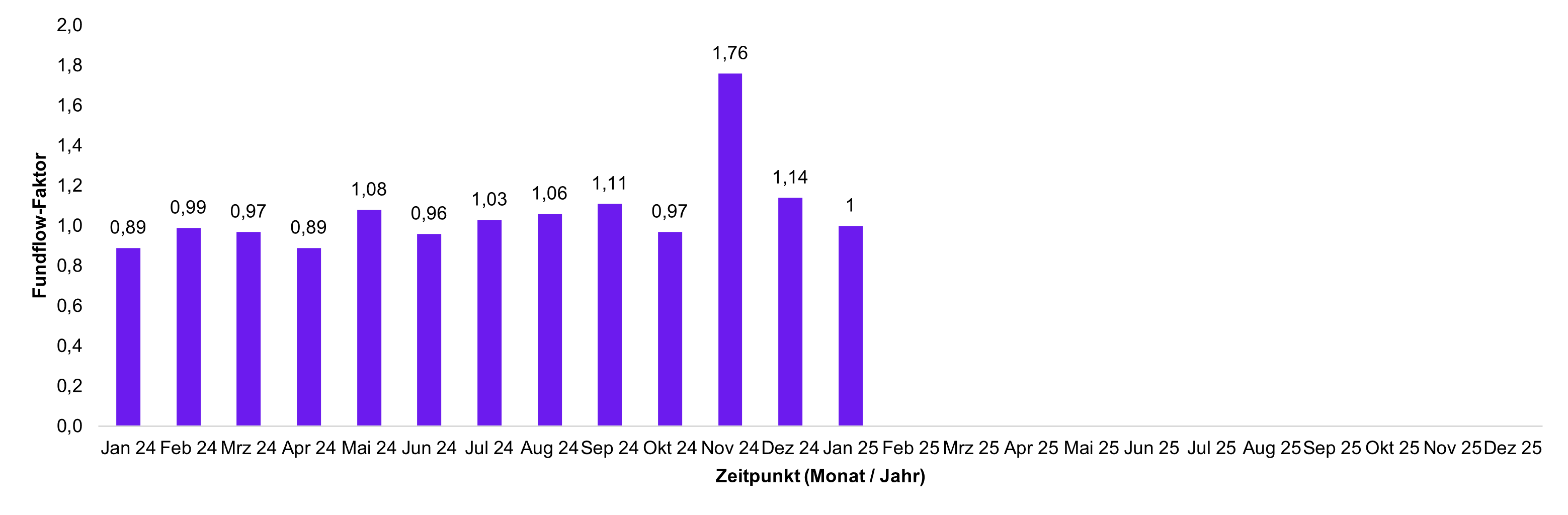 Veränderungen der Mittelzuflüsse und Mittelabflüsse werden über den Fundflow-Faktor ausgedrückt. Dabei werden die monatlichen Mittelzuflüsse des Berichtszeitraums in Relation zu den monatlichen Mittelabflüssen gesetzt. Bei einem Fundflow-Faktor über eins überwiegen die Mittelzuflüsse, bei einem Fundflow-Faktor unter eins die Mittelabflüsse.