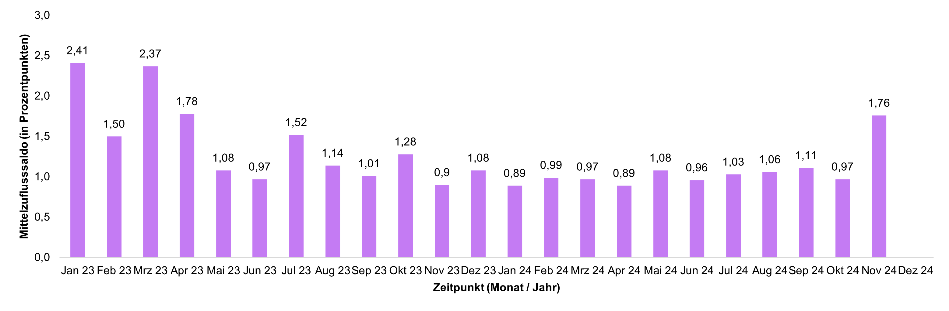 Veränderungen der Mittelzuflüsse und Mittelabflüsse werden über den Fundflow-Faktor ausgedrückt. Dabei werden die monatlichen Mittelzuflüsse des Berichtszeitraums in Relation zu den monatlichen Mittelabflüssen gesetzt. Bei einem Fundflow-Faktor über eins überwiegen die Mittelzuflüsse, bei einem Fundflow-Faktor unter eins die Mittelabflüsse.